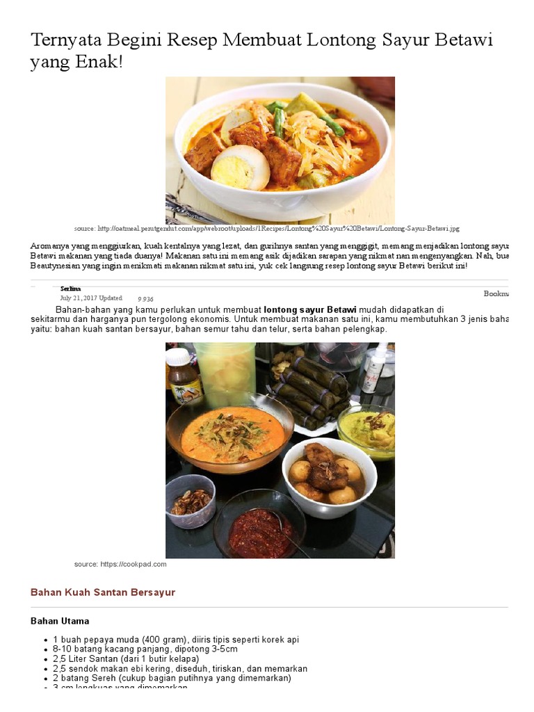 Biasanya, labu siam akan dimasak jadi sayur lodeh atau ditumis. Kalo orang betawi biasanya bikin sayur godoknya pakai pepaya mud. Makanan ini ibarat jajanan favorit di batam, khususnya di area batam industrial park di kawasan muka kuning. Resep lontong sayur betawi komplit. Tak sulit dibuat, berikut resep lontong sayur untuk dibuat di rumah.